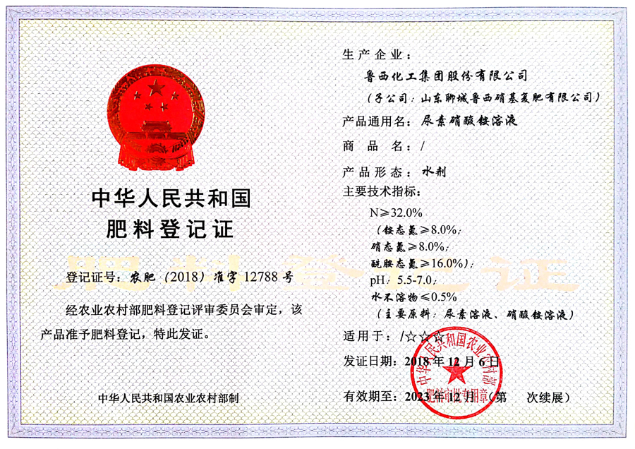 摘要:12月21日,收到了農(nóng)業(yè)農(nóng)村部肥料評審登記管理處寄來的魯西集團尿素硝酸銨溶液(32%)肥料登記證,登記證號為“農(nóng)肥(2018)準字12788號”,登記證有效期5年。