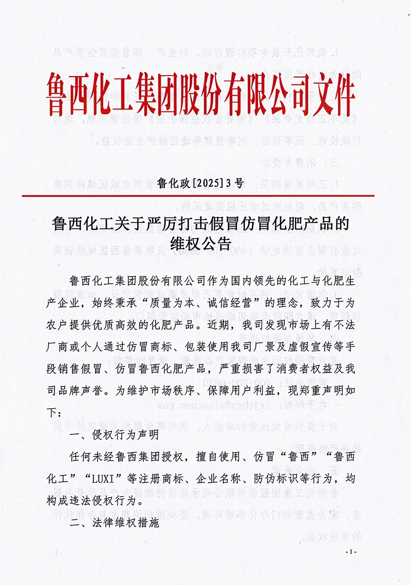 魯西化工關(guān)于嚴(yán)厲打擊假冒仿冒化肥產(chǎn)品的維權(quán)公告
